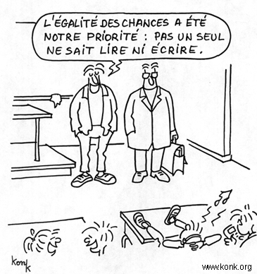 Dans tous les cas, le même schéma se reproduit : l'absence d'autorité des professeurs ne contribue qu'à développer l'ignorance en brisant toutes les relations humaines parmi les enseignants. A cela s'ajoute la volonté de ne rien imposer aux élèves. Le mythe de l'efficacité de la méthode globale sévit à plein. Les élèves ne savent pas lire, mais ils savent comment utiliser les préservatifs depuis que les politiques comme Ségolène Royale et Luc Châtel se soucient de leurs sexualités, et non de leurs avenirs. Cette idéologie, que l'on appelle la Nouvelle Pédagogie, se base sur l'inversion des valeurs : la sélection est bannie ; l'égalité remplace l'équité ; le consensus remplace l'autorité (en principe), etc...Et l'Éducation Nationale reste le budget le plus important de l'État français.