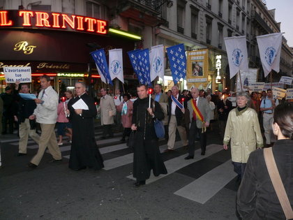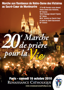 Jean-Pierre Maugendre, président de Renaissance Catholique : Notre première Marche a eu lieu le 20 octobre 1991. Nous partions alors de Versailles, le dimanche matin, et après une messe célébrée à 12 h en plein air dans le Bois de Boulogne, nous achevions notre parcours par un Salut du Saint-Sacrement sur le parvis de la basilique du Sacré-Cœur de Montmartre. Dès le début, notre intuition était que le combat pour la défense de la Vie ne pouvait pas ne revêtir qu'une dimension naturelle. Qui a vu de ses yeux le comportement des contre-manifestants lors des rosaires publics organisés par SOS Tout-Petits et le docteur Dor, ne peut plus ignorer le caractère satanique de ce déferlement de la culture de mort. Il y a les tenants "présentables" de cette contre-culture : Valéry Giscard d'Estaing, Jacques Chirac, Simone Veil,… et les nervis anarcho-trotskystes, vêtus de noir, le blasphème à la bouche chargés de faire taire les opposants par la violence du « harcèlement démocratique », cher à Jean-Christophe Cambadélis. Derrière les flots de sang et les océans de larmes versés depuis cinquante ans, au nom de la libération de la femme –surtout libération de la braguette–, se cache, de plus en plus mal, « celui qui est homicide depuis le commencement ». Tout cela nous semblait exiger plus qu'une simple protestation publique, si légitime fut-elle, mais en plus une expiation, une réparation et une intercession publiques. Il nous semble que s'applique à la Culture de mort ce paragraphe de l'Ecriture sainte : « Cette sorte de démon ne se vainc que par la prière et le jeûne » (Marc IX, 29).En 1994, nous avons modifié notre dispositif car la messe en plein air dans le Bois de Boulogne, au mois d'octobre, était très éprouvante pour les participants et le célébrant, en raison des conditions climatiques… Nous avons alors bénéficié pendant six ans, de l'hospitalité de la paroisse Notre-Dame du Lys, à Paris, où la messe était célébrée en fin de matinée avant que nous ne rejoignions le Sacré-Cœur que les autorités du sanctuaire avaient mis à notre disposition depuis 1992, la seule contrainte étant que le Salut ne pouvait pas avoir lieu trop tôt à cause des offices en fin de journée. En 2000, la Préfecture de Police nous a signifié que, pour des raisons de sécurité, il ne nous était plus possible de franchir la Seine. Il nous a donc fallu trouver un point de départ sur la rive droite et c'est ainsi que le lieu de départ est aujourd'hui sur le parvis de la basilique Notre-Dame des Victoires. Depuis dix ans, notre Marche prend la forme d'une procession aux flambeaux, afin d'en rehausser la tenue.