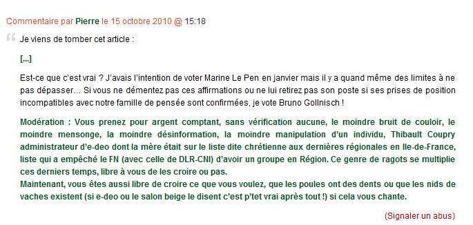 Franck Beeldens, on le voit, n'a rien à faire au Front national. Nous demandons le retrait de l'investiture que lui a accordé le FN pour les cantonales du printemps 2011.